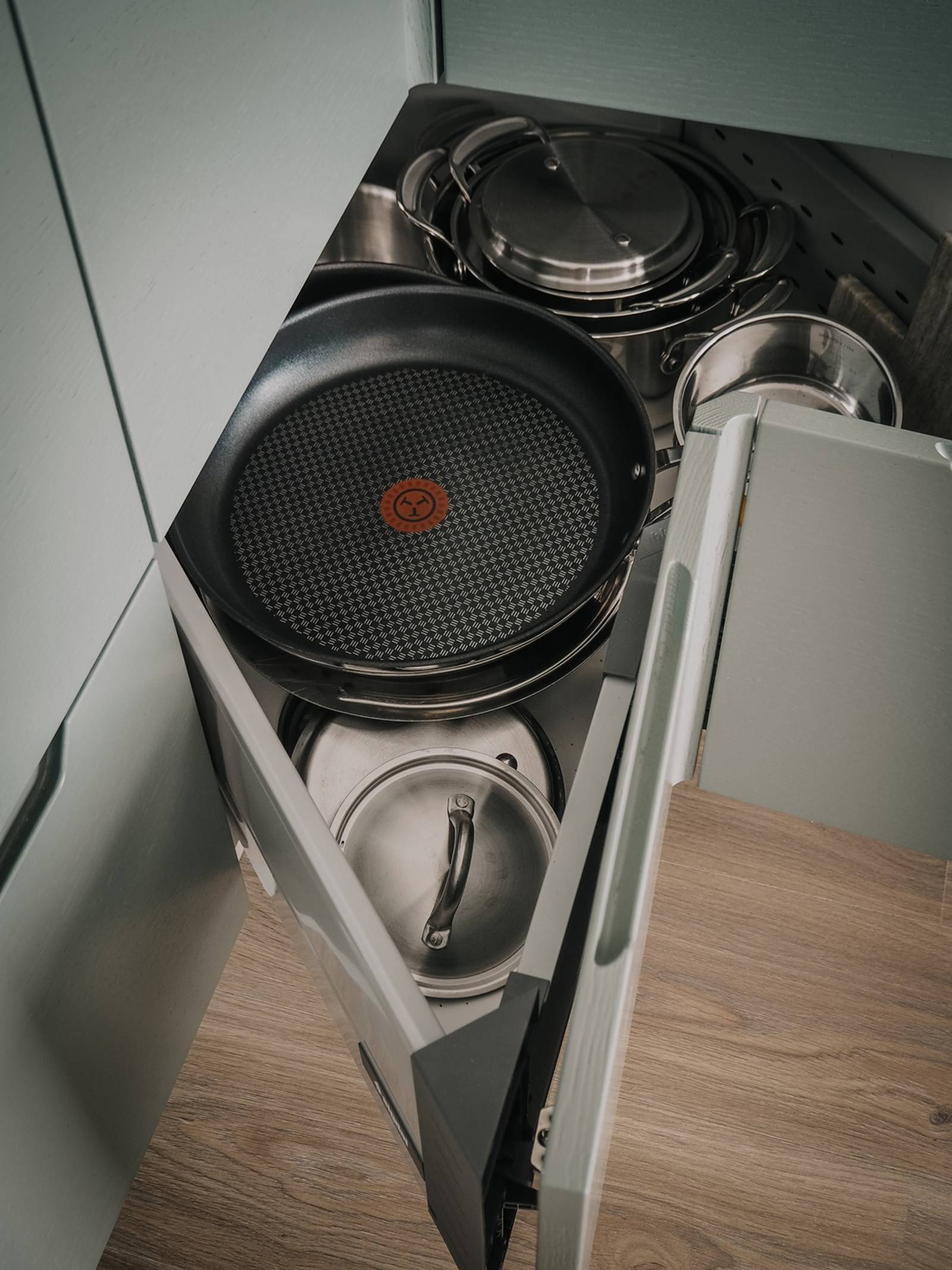 En av Amalie sine absolutte favoritter på kjøkkenet er hjørneskuffen. Akkurat denne skuffen er spesialbestilt, men skal du ha med 3 skuffer så tilhører denne Sigdal sitt standard sortiment. Med denne løsningen får du utnyttet all plass på kjøkkenet, også det vanskelige hjørnet.