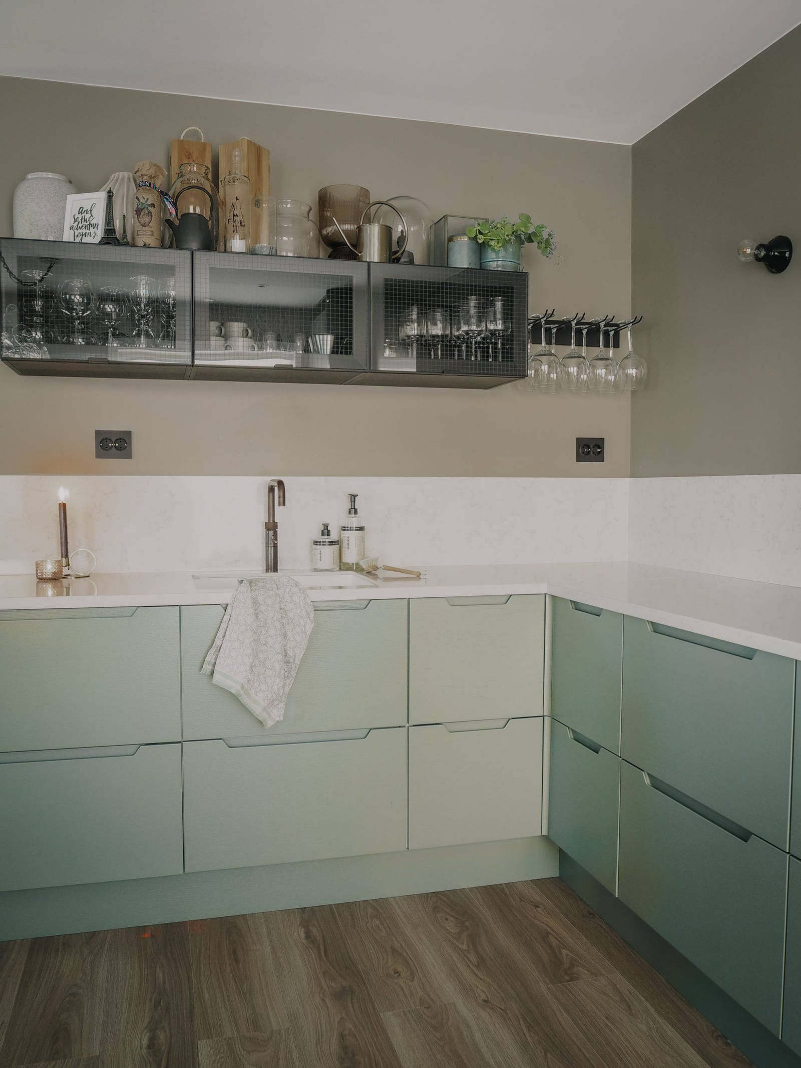 Det er få overskap på kjøkkenet for å skape et luftig uttrykk. Men, Amalie valgte 3 små skap uten ramme istedenfor bredre skap på den ene kortsiden. Skapene er fra vår Bistro-serie som gir kjøkkenet et herlig preg av fransk bistro.
