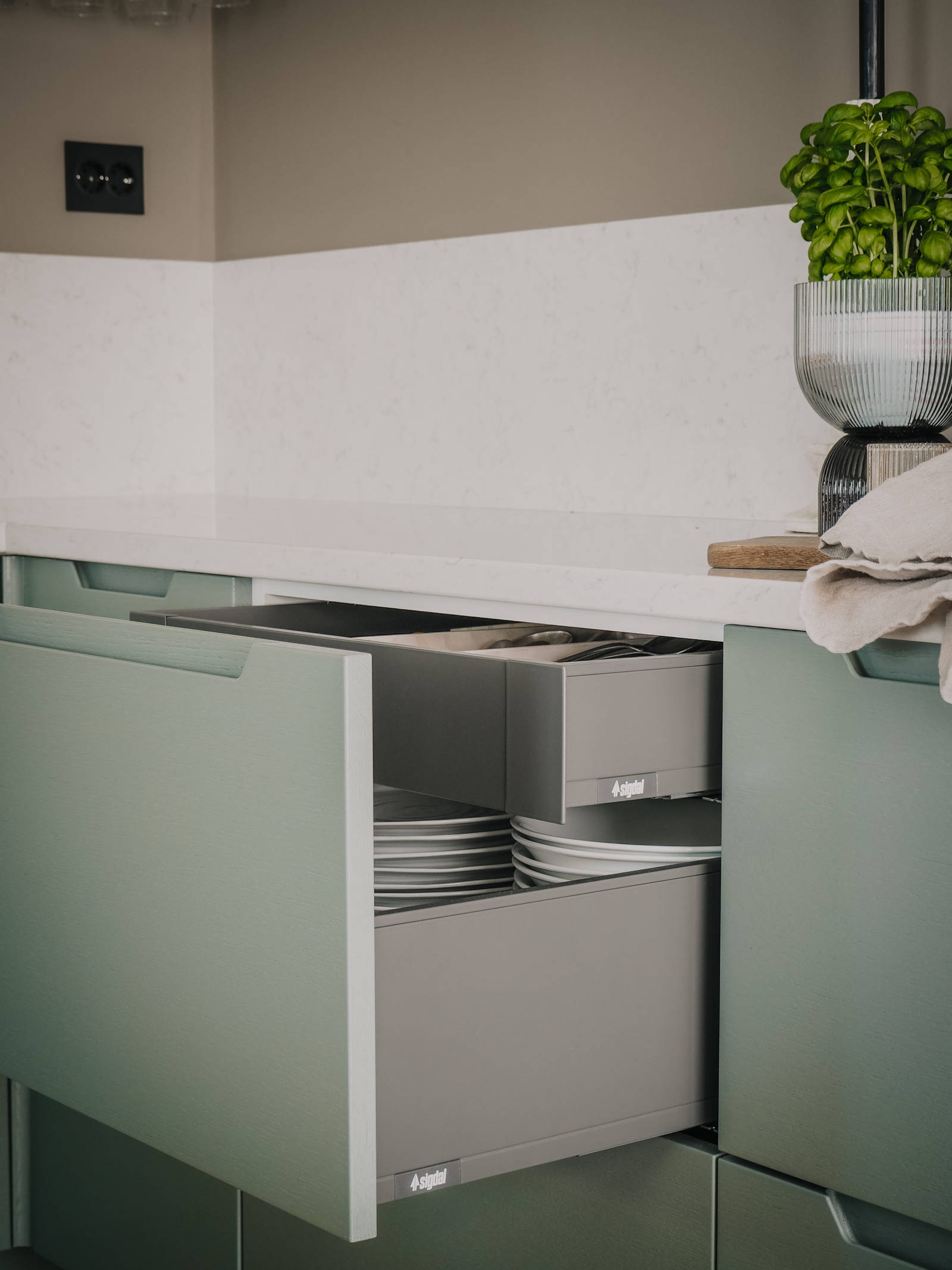 Ro og orden på kjøkkenet er viktig, både utvendig og innvendig. Istedenfor å velge tradisjonell 3-skuffers seksjoner, har Amalie valgt å ha to skuffer for et ryddigere uttrykk. Med innerskuffer får du likevel kontroll på bestikk og andre småting til kjøkkenet. Skuffesystemet Legrabox sørger for oversikt og orden i alle skuffer.