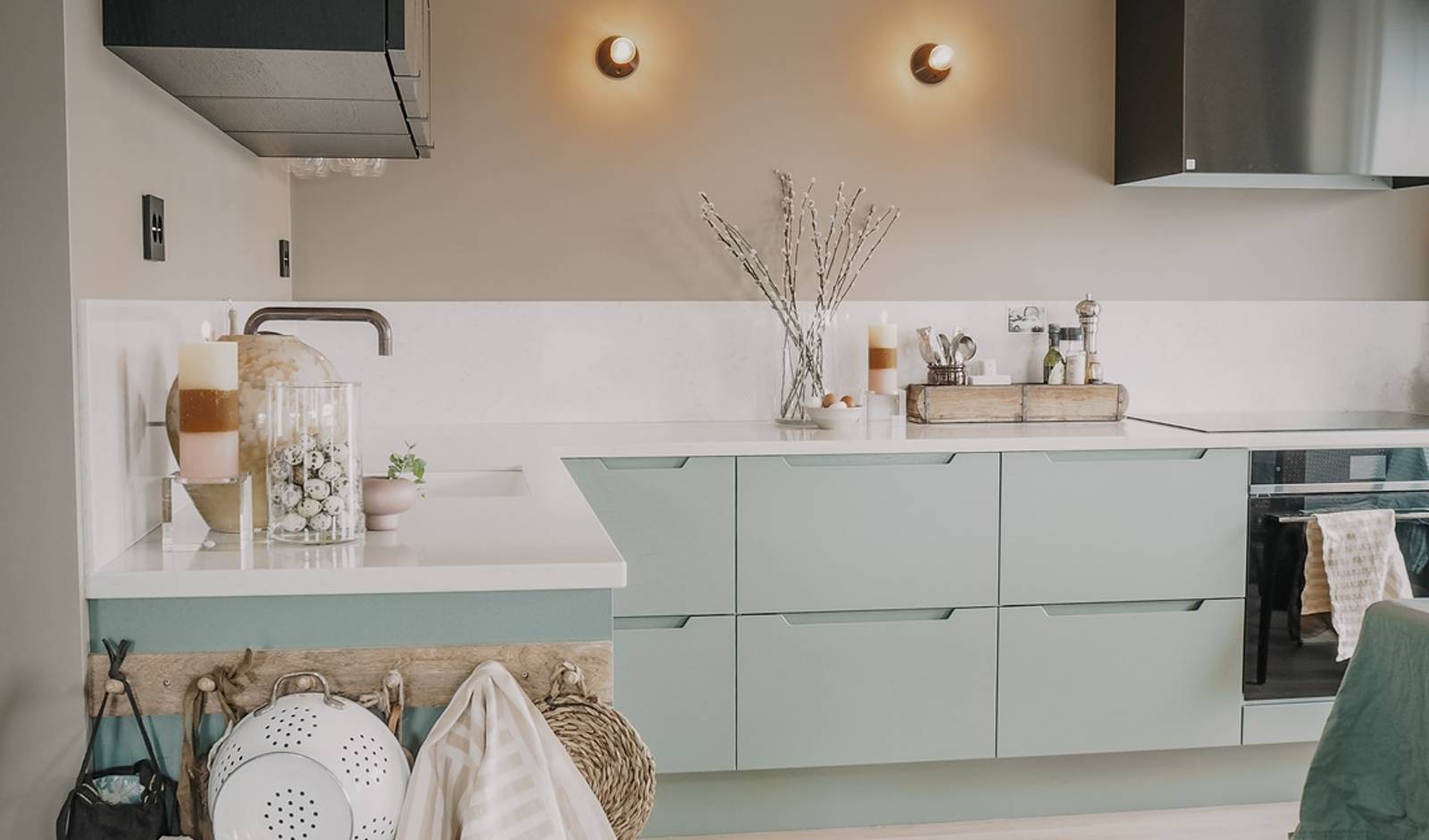 Da Amalie plana sitt kjøkken, var detaljene viktig for å få et funksjonelt og velfungerende kjøkken. Kjøkkenmodellen heter Tun Eik og er malt i en av Amalie sine favorittfarger, nemlig grønn. Velger du et kjøkken fra Sigdal kan du velge en av våre standardfarger eller du kan blande din egen farge. Sammen med de sorte overskapene får kjøkkenet et røft og rocka preg. Benkeplaten og oppkanten er Silestone levert av Gautvik Steinindustri.
