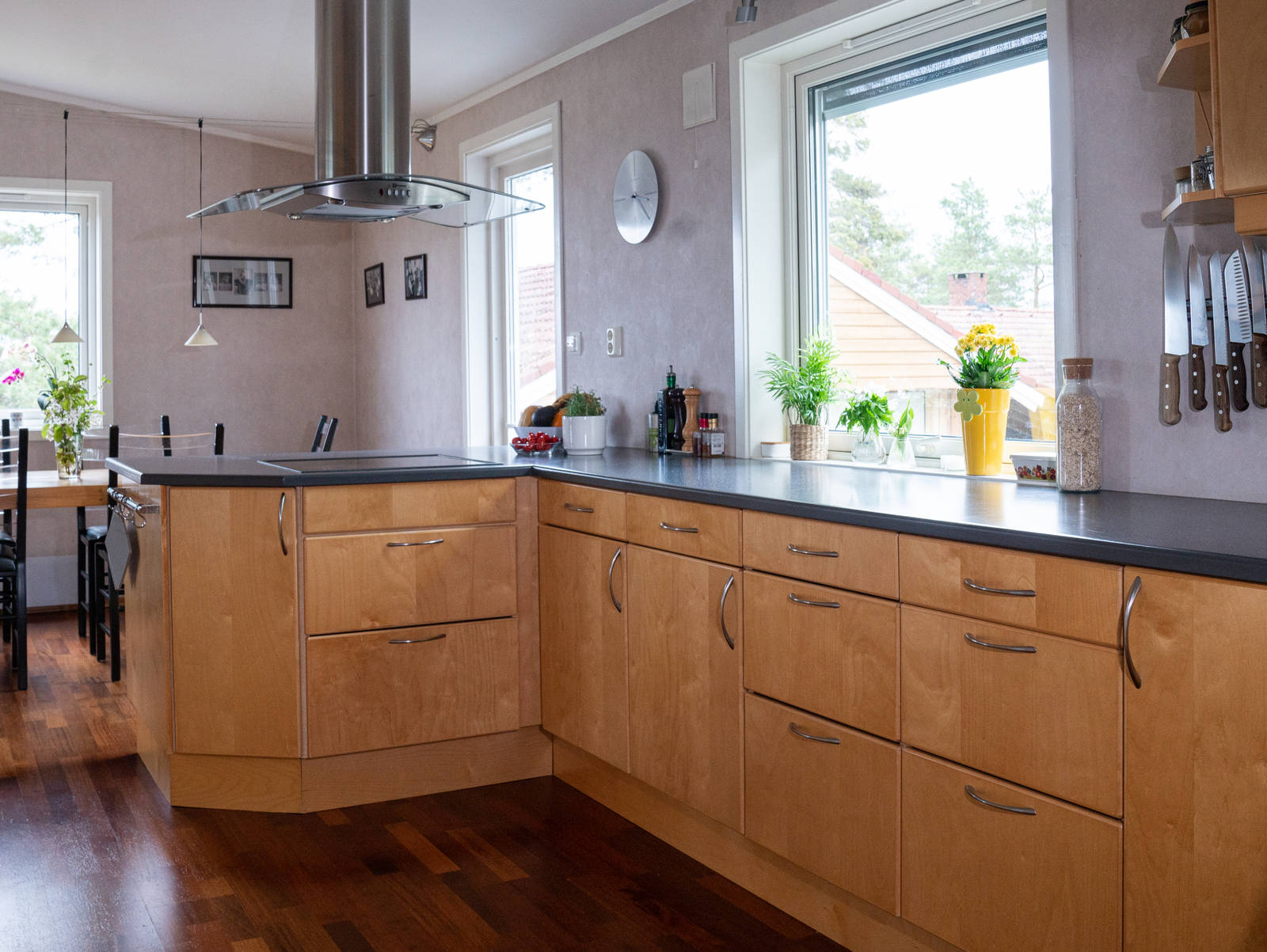 – Vi pusset opp kjøkkenet da vi flyttet inn i 2001, og gjorde det aller meste selv. Da var rommet mye mindre og hadde kun to vinduer, forteller hun.