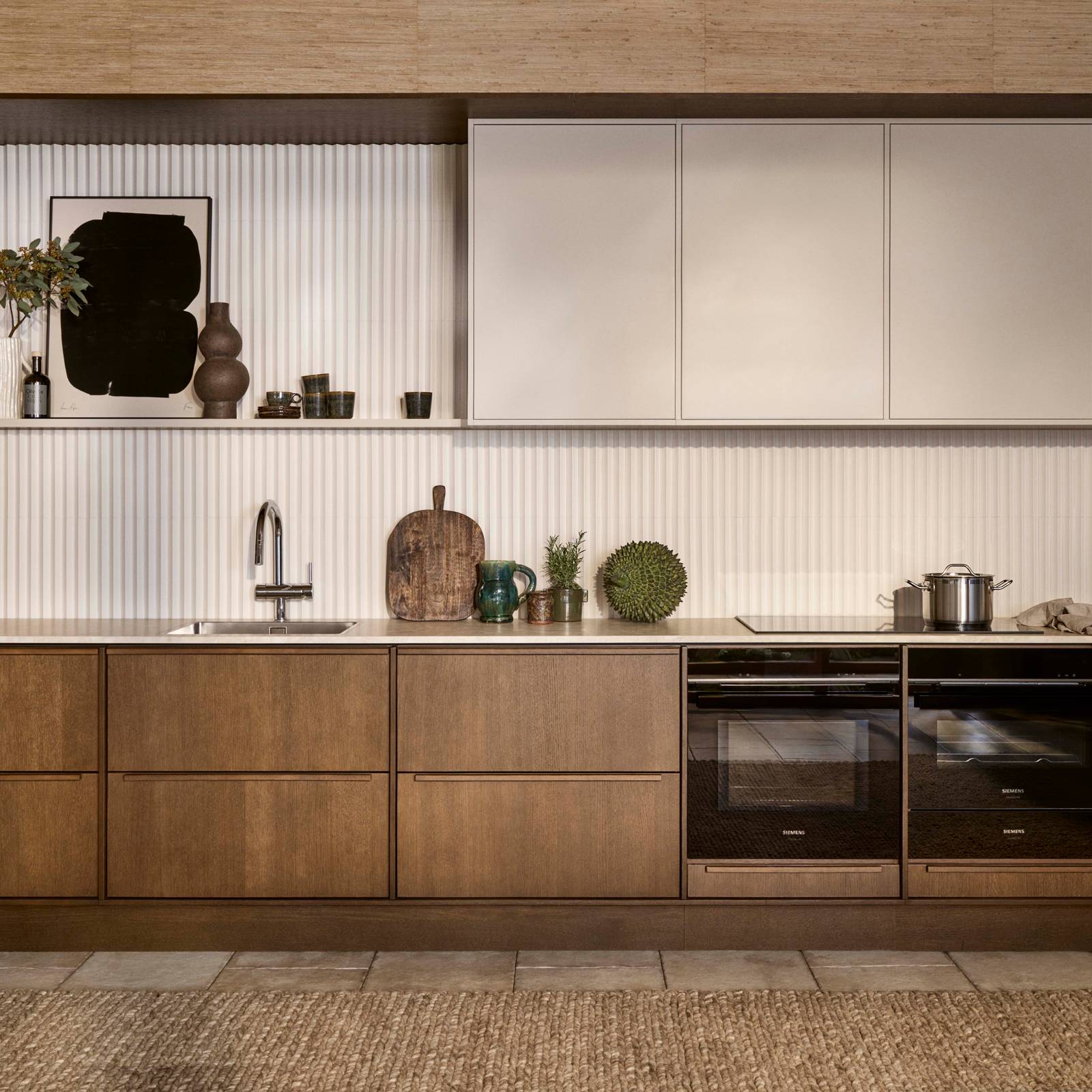 Avrundede kanter og pene overskap med rillede montrer. Kjøkkenenheter med mer solid design gir en skulpturell, elegant følelse der mykt matches med hardt for en perfekt balanse.