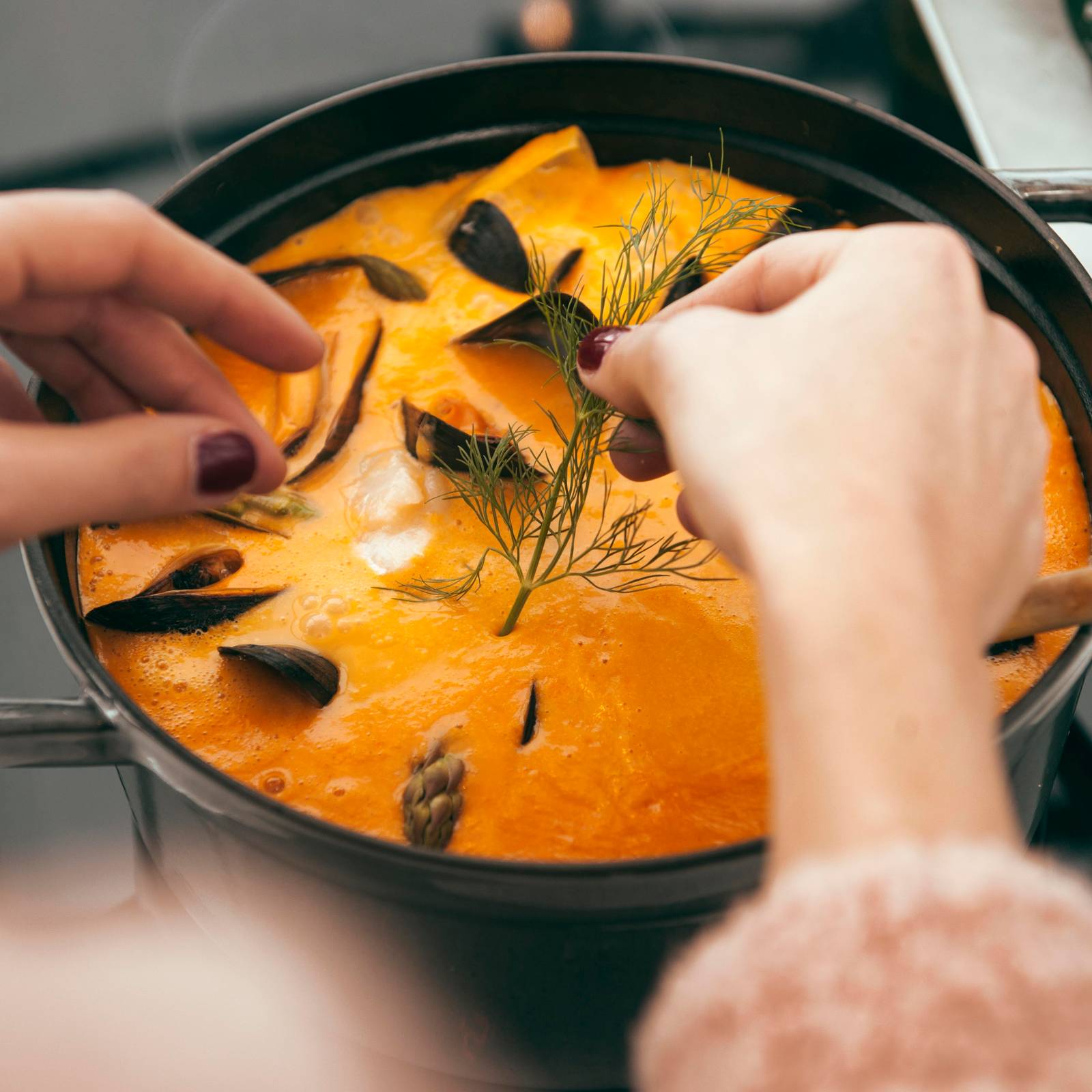 - Tilsett fisk og asparges og la gryten småkoke i ca. 4–5 min til fisken er gjennomkokt. Ha i skjell og dill mot slutten. Smak til med salt og pepper og server gryten med godt surdeigsbrød og ev. litt aioli.