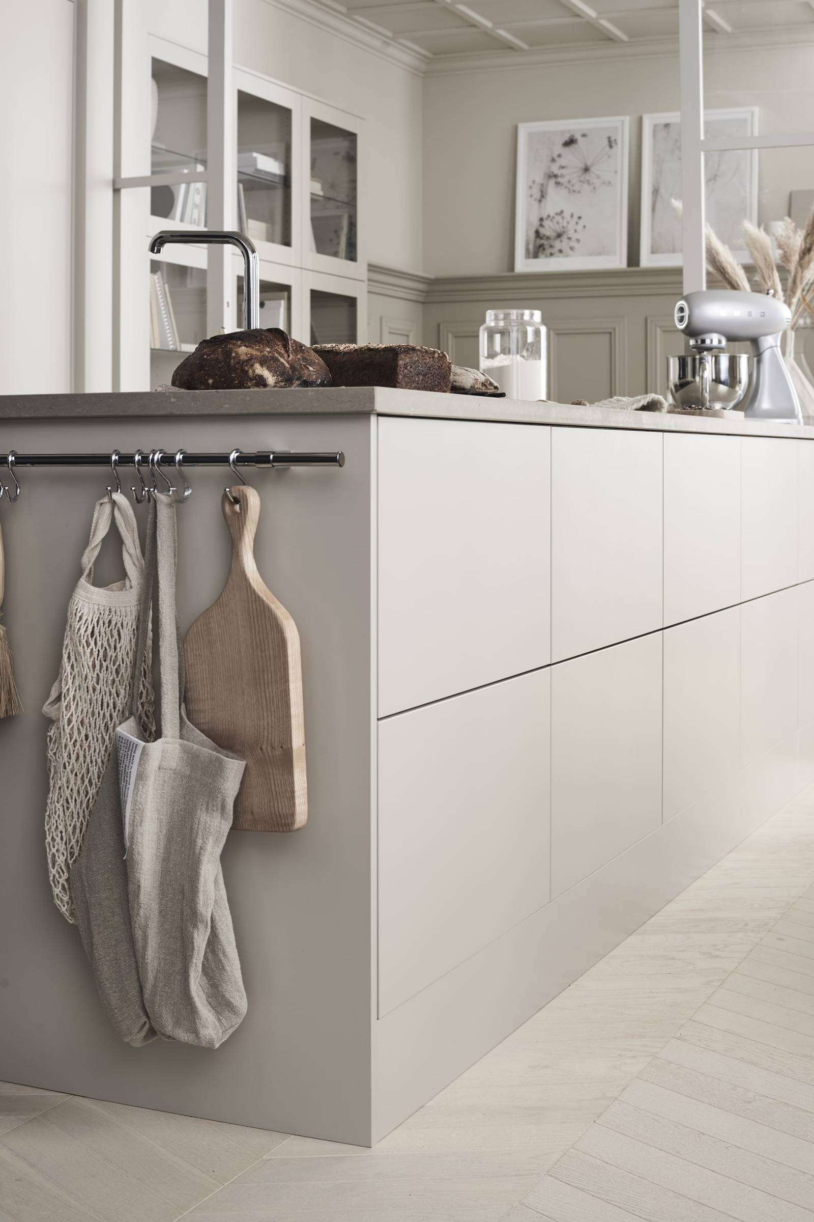 - Velg malte skapdører i en farge som passer inn eller er lett å matche med andre farger i interiøret. Varme nyanser av grå og beige er eksempler på nøytrale, men samtidig elegante farger som smelter inn i de fleste hjem. Skapdører med integrerte håndtak gir en minimalistisk stil.