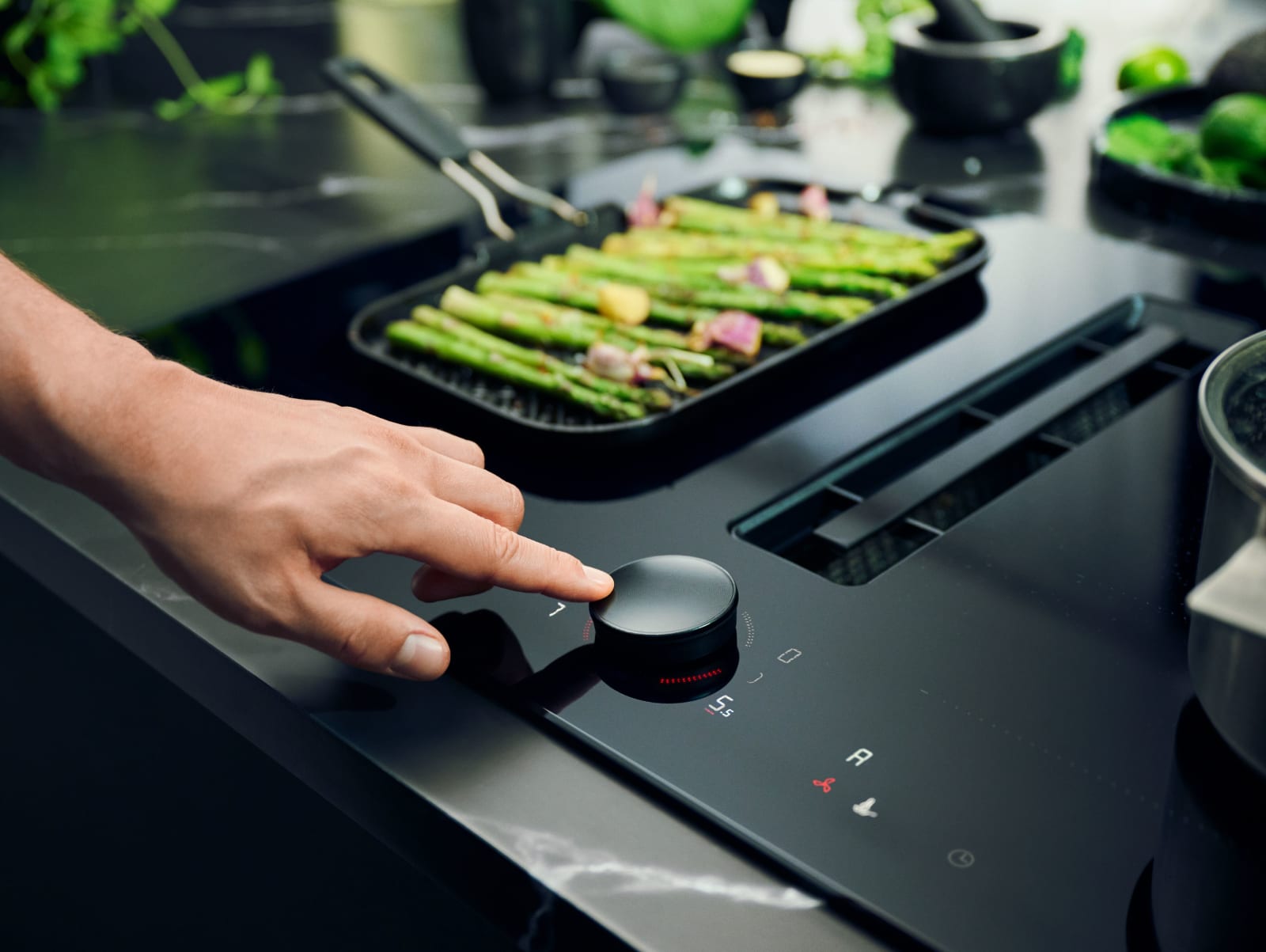 Den magnetiske Twist Pad Flex® sikrer en presis og enkel kontroll ikke bare av platetoppen – men også av ovnen og kaffemaskinen. Bare trykk på den intuitivt. Aktiver ønsket koke-sone på platetoppen ved å vippe og velge effektnivå ved å vri på den geniale bryteren. Lyset rundt Twist Pad Flex® viser status til den valgte koke-sonen din uansett om den er oppvarmet eller ikke. Så uansett om du brygger deg en kopp kaffe eller baker en bursdagskake, er Twist Pad Flex® klar til å bytte mellom oven og kaffemaskin, slik at du kan kontrollere dem på en sikker og praktisk måte.