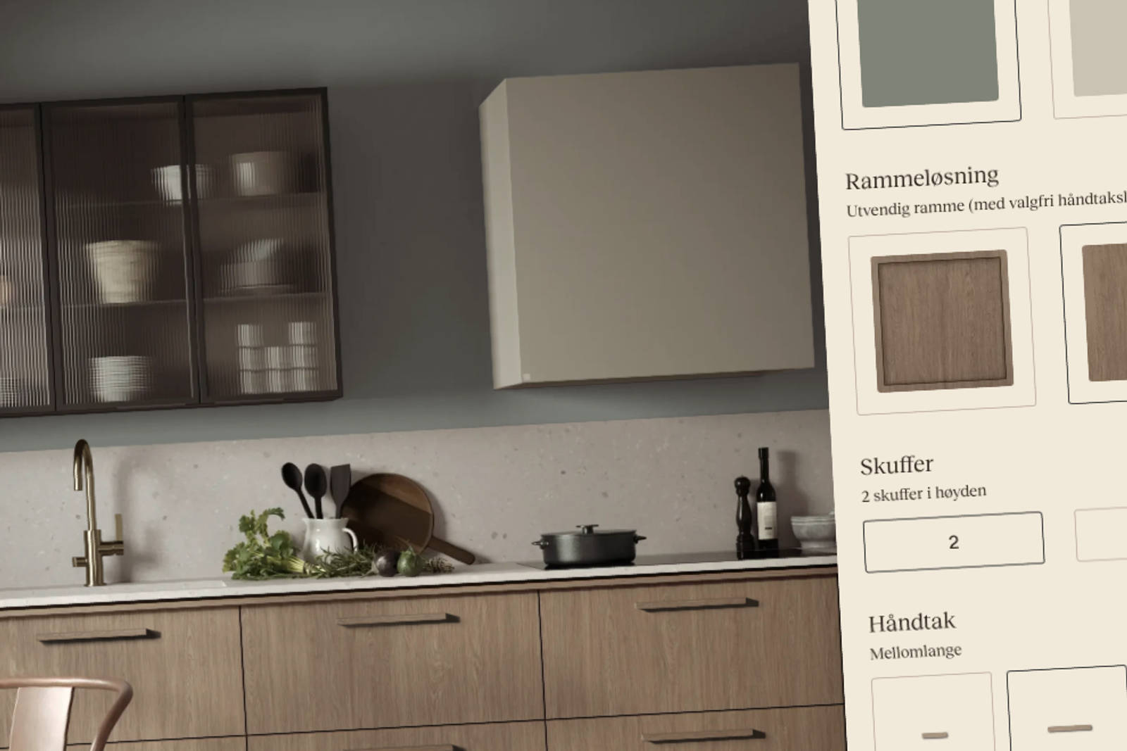 Med vårt nye designverktøy kan du style ditt Signatur Favn kjøkken ved blant annet å endre veggfarge, rammeløsning, håndtak, benkeplate og skapkombinasjon. Her får du sett mulighetene og kan skape ulikt uttrykk basert på akkurat dine valg.