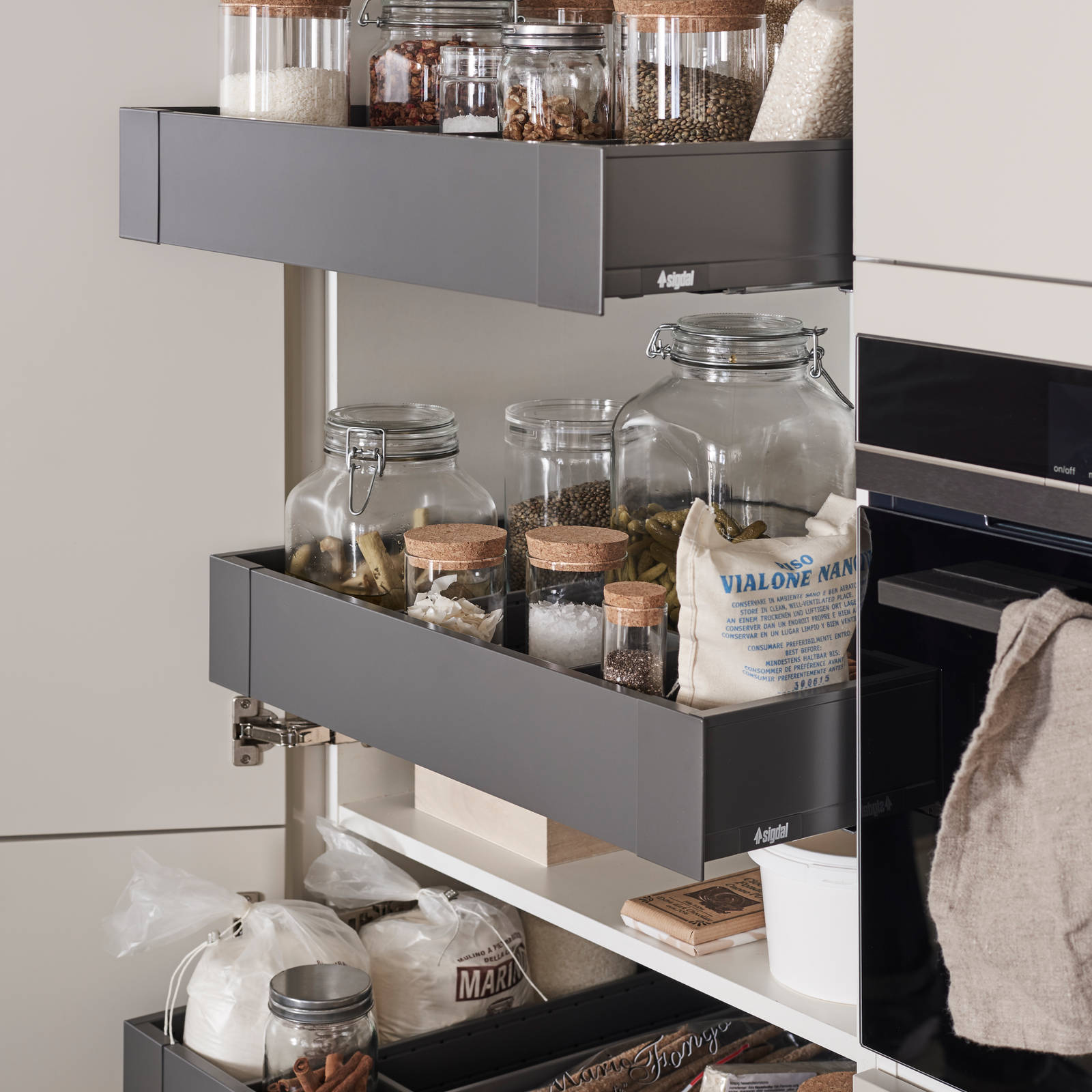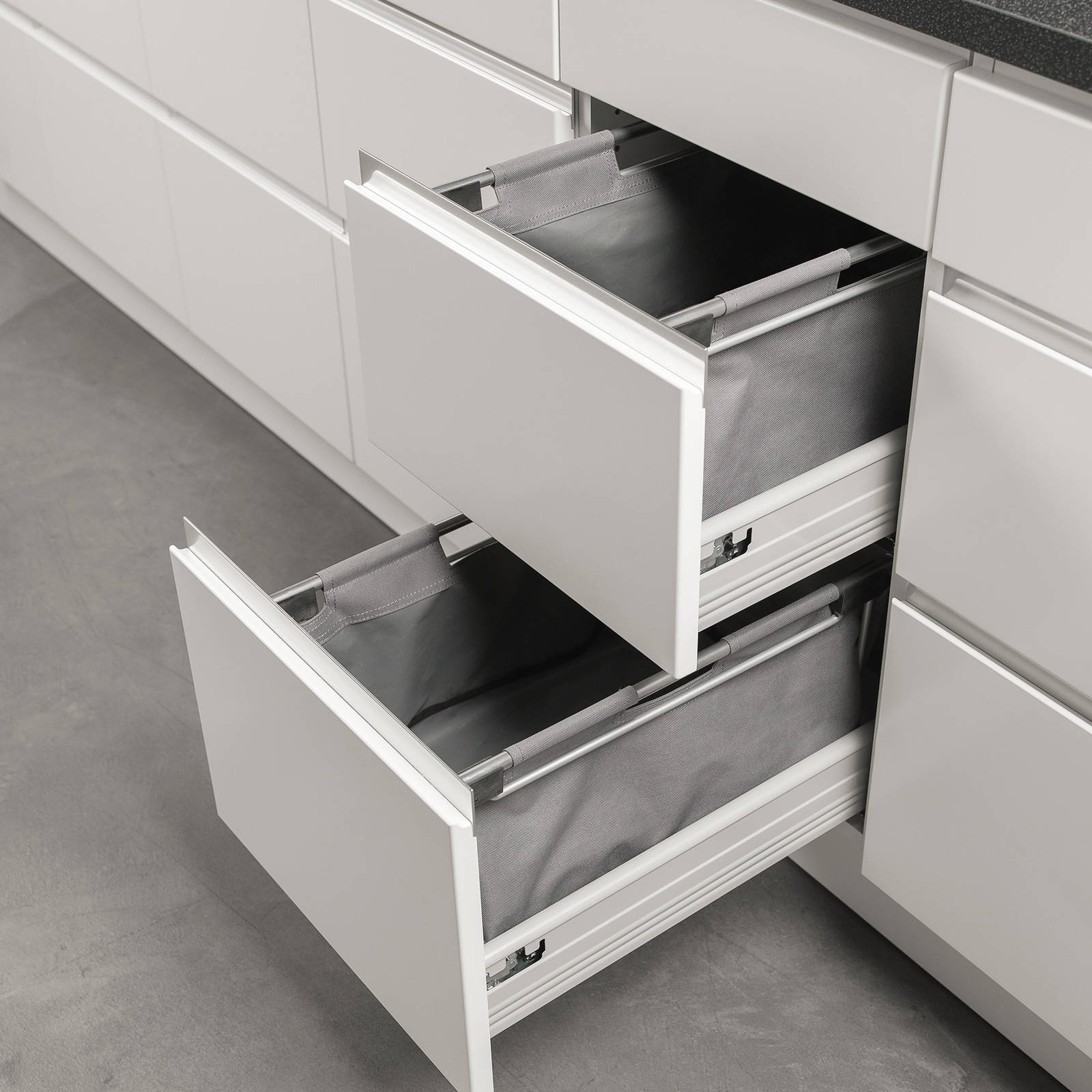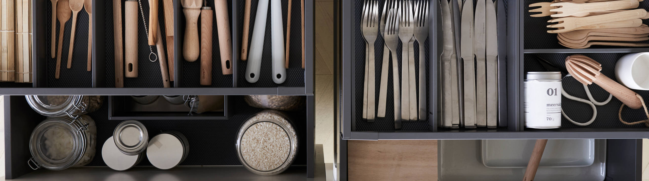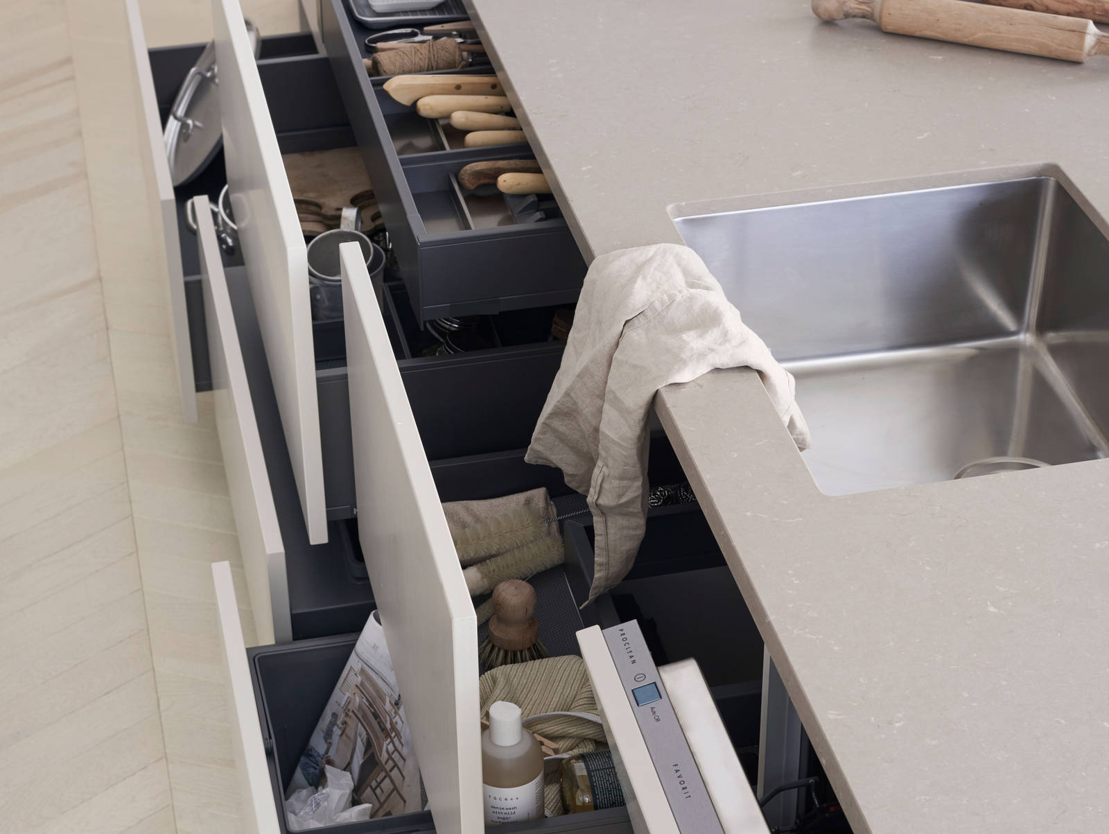 Tandembox er skuffen med flest muligheter, noe som gir kjøkkenet et romsligere organiseringsystem. Alle skuffer har fulluttrekk og skuffedemping som standard.