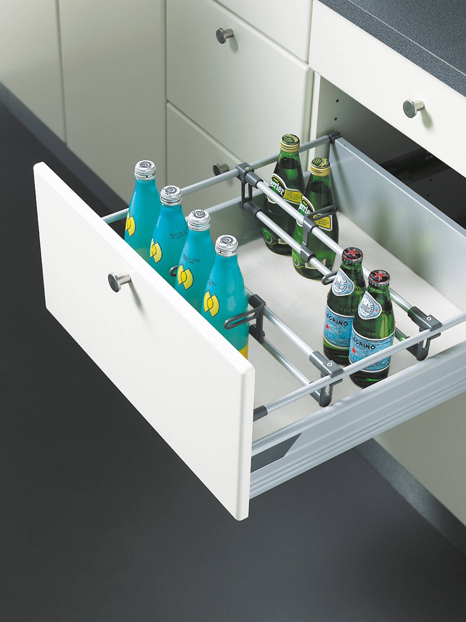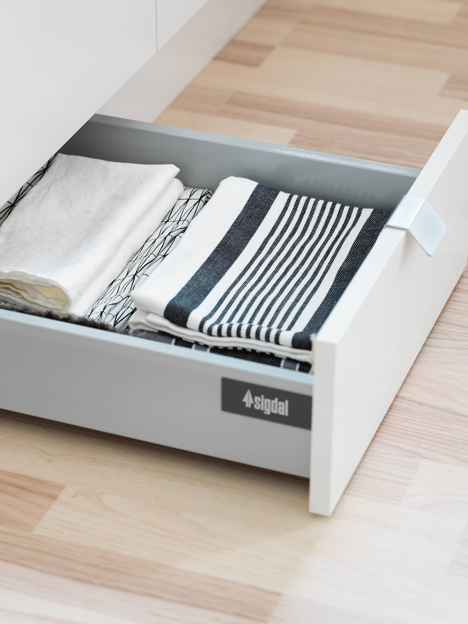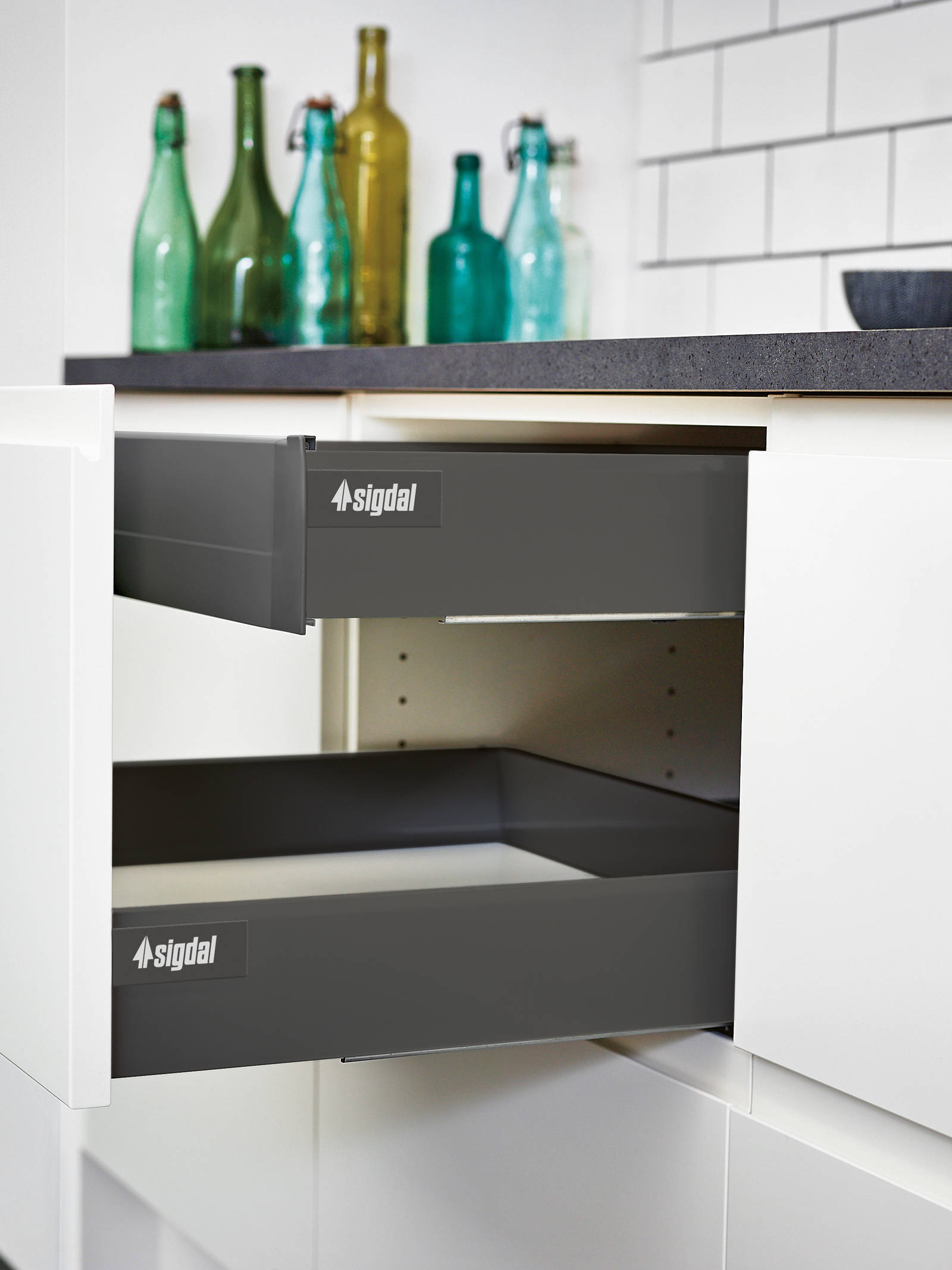 Tandembox er skuffen med flest muligheter, noe som gir kjøkkenet et romsligere organiseringsystem. Alle skuffer har fulluttrekk og skuffedemping som standard. Skuffene er testet for en totalvekt inntil 30 kg (30-60 cm) og 50 kg (80-100 cm), inkludert selve skuffen og fronten.