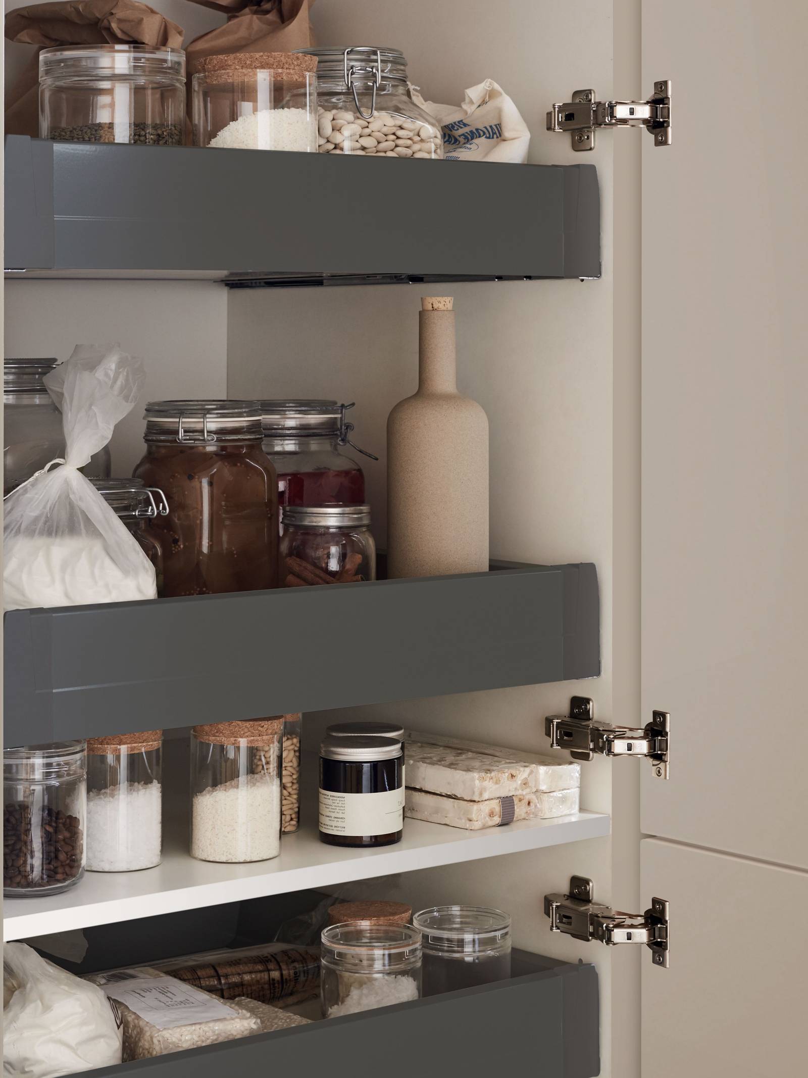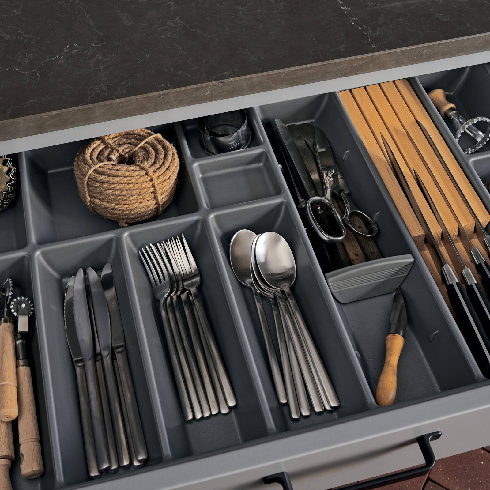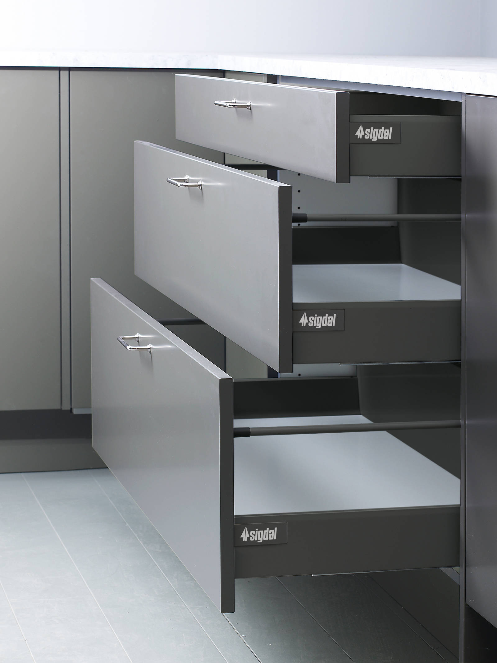 Tandembox er skuffen med flest muligheter, noe som gir kjøkkenet et romsligere organiseringsystem. Alle skuffer har fulluttrekk og skuffedemping som standard. Skuffene er testet for en totalvekt inntil 30 kg (30-60 cm) og 50 kg (80-100 cm), inkludert selve skuffen og fronten.