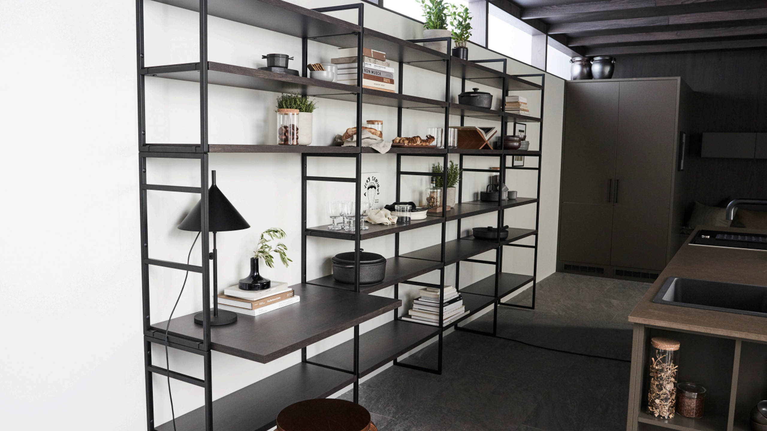 Kjøkken Line Høst med stor vegghylle og integrert skrivebord.