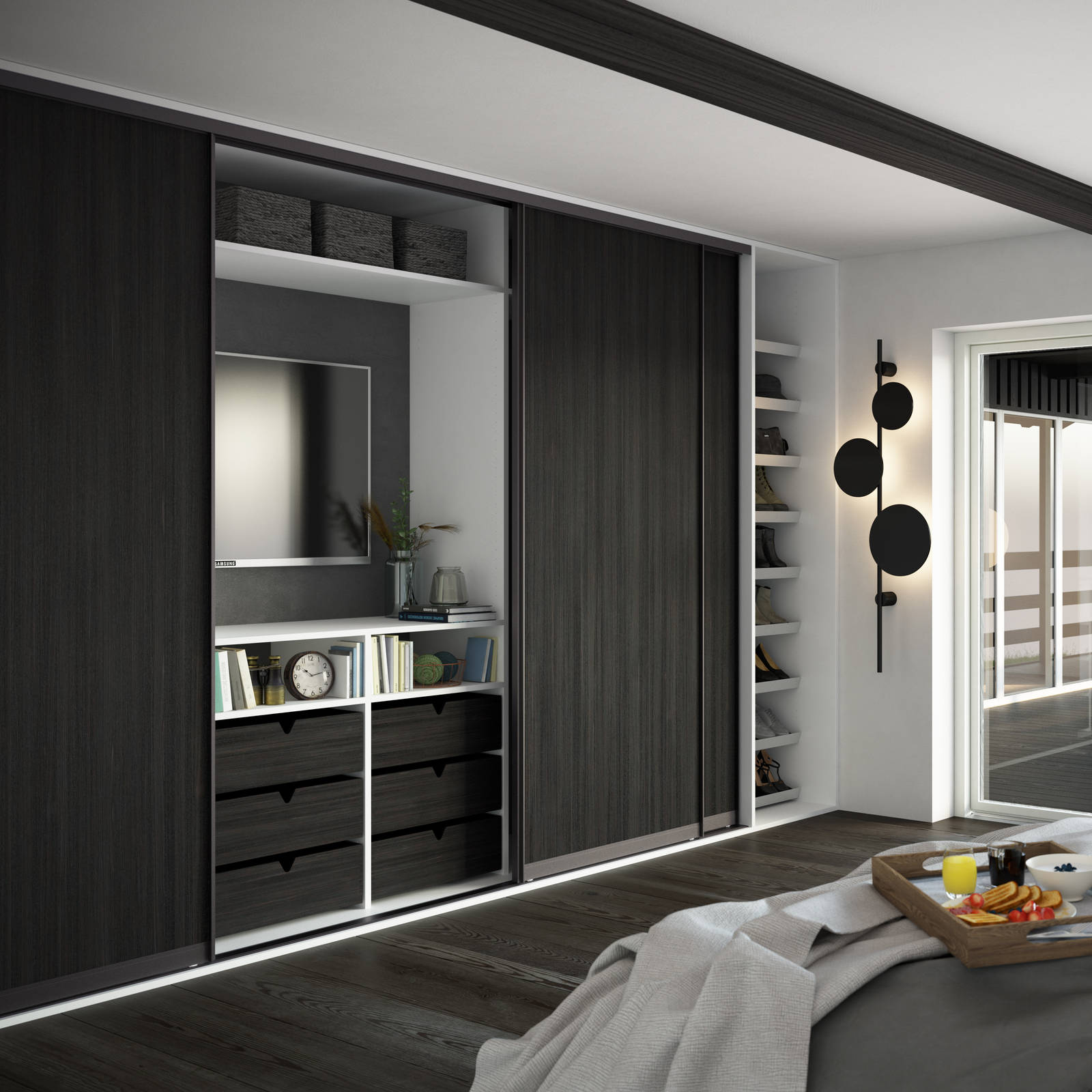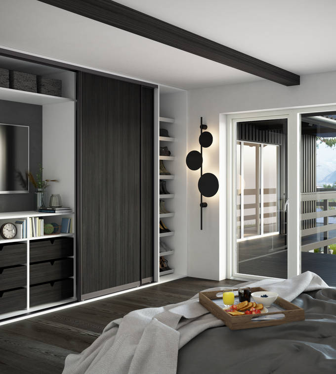 Alu slim er en garderobemodell med et eksklusivt uttrykk. Med gulvhjul som er skjult i dørens bunnskinne er den perfekt som romdeler eller til walk-in løsninger.